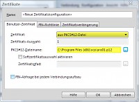- Zunächst werden also dem AVC die erforderlichen Zertifikate zur Verfügung gestellt. Dies geschieht über Konfiguration -> Zertifikate -> hinzufügen. Dort PKCS#12-Datei auswählen und die mit XCA erstellte Datei in AVC installieren. Gegebenenfalls noch weitere erforderliche Einstellungen vornehmen. Somit stehen dem VPN-Client die notwendigen Zertifikate zur Verfügung und können für die weitere Konfiguration verwendet werden.