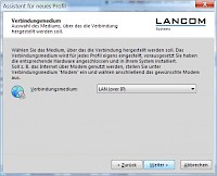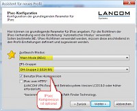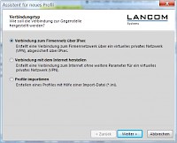 - Zu guter Letzt muss dann noch ein geeignetes "Main Mode" Profil im AVC erstellt werden. Dies erfolgt über Konfiguration -> Profile hinzufügen. Nun öffnet sich ein Verbindungs-Assistent. Als Verbindungstyp IPSec auswählen.Im folgenden Dialog einen eindeutigen Profilnamen vergeben. Weiter geht es mit der Auswahl des Verbindungsmediums. In der Regel ist dieses entweder LAN (over IP) oder automatische Medienerkennung.