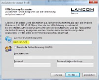- Im nächsten Schritt erfolgt die Eingabe der Adresse des VPN-Gateways. Dies kann ein symbolischer Name oder eine IP-Adresse sein. Häufig wird hier im privaten Umfeld eine DynDNS Adresse verwendet.