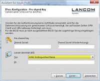 - Ein Pre-shared Key wird für Main Mode VPN nicht verwendet. Die entsprechenden Felder bleiben leer. Die lokale Identität ist im Router und im Client Zertifikat konfiguriert. Sie wird beim Zertifikatsaustausch überprüft und bleibt hier ebenfalls leer.
