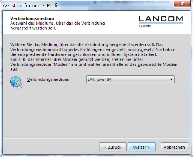 - Zu guter Letzt muss dann noch ein geeignetes "Main Mode" Profil im AVC erstellt werden. Dies erfolgt über Konfiguration -> Profile hinzufügen. Nun öffnet sich ein Verbindungs-Assistent. Als Verbindungstyp IPSec auswählen.Im folgenden Dialog einen eindeutigen Profilnamen vergeben. Weiter geht es mit der Auswahl des Verbindungsmediums. In der Regel ist dieses entweder LAN (over IP) oder automatische Medienerkennung.