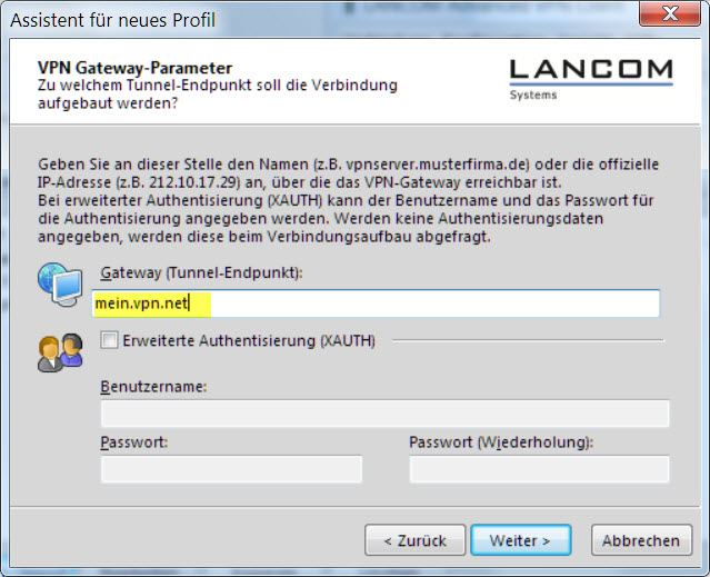 - Im nächsten Schritt erfolgt die Eingabe der Adresse des VPN-Gateways. Dies kann ein symbolischer Name oder eine IP-Adresse sein. Häufig wird hier im privaten Umfeld eine DynDNS Adresse verwendet.