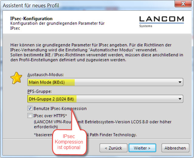 - Anschließend erfolgt dann die IPsec Konfiguration. Der Austausch-Modus ist zwingend auf Main Mode zu setzen. Die PFS-Gruppe ist so zu wählen wie es im Router unter Vebindungsparameter konfiguriert wurde. Im Beispiel wurde DH-Gruppe 2 verwendet. IPsec over HTTPS wird für das Main Mode VPN nicht verwendet.