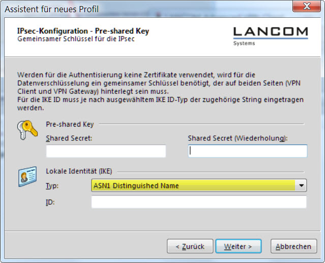 - Ein Pre-shared Key wird für Main Mode VPN nicht verwendet. Die entsprechenden Felder bleiben leer. Die lokale Identität ist im Router und im Client Zertifikat konfiguriert. Sie wird beim Zertifikatsaustausch überprüft und bleibt hier ebenfalls leer.