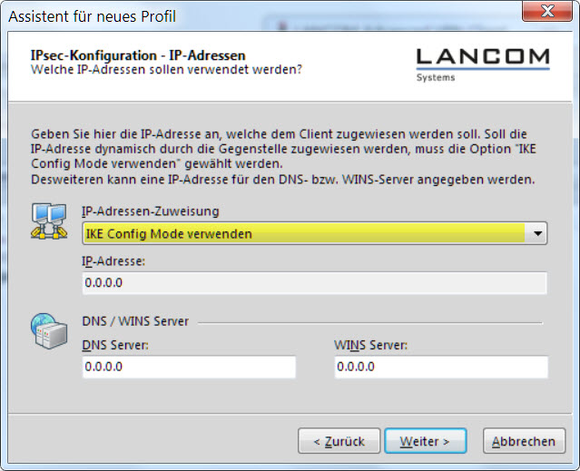 - Für die IP-Adressen Zuweisung ist im folgenden Dialog der "IKE Config Mode" zu verwenden. Alle weiteren Einstellmöglichkeiten auf dieser Dialogseite können ignoriert werden.