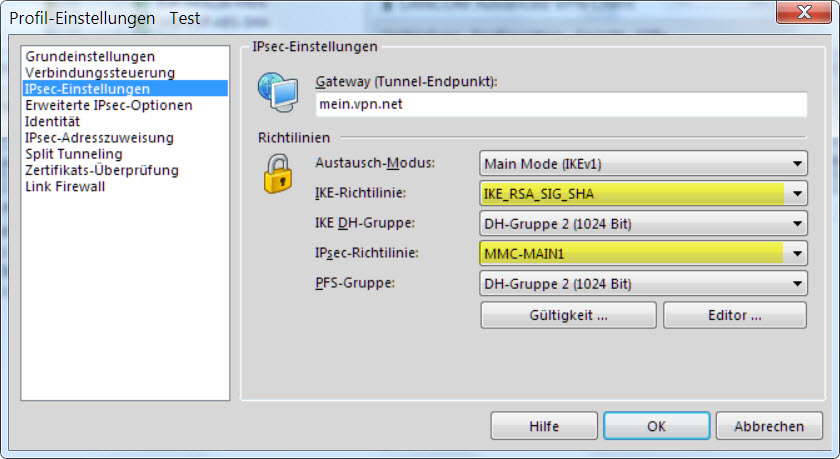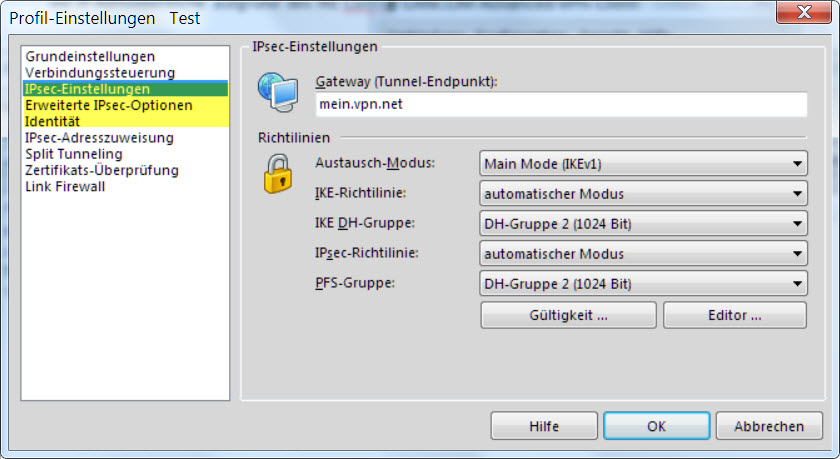 - Dazu wird das erstellte Profil in der Liste der Profile markiert und mit <Bearbeiten> geöffnet. Im folgenden Dialog sind die Einträge für die IPsec Einstellungen, erweiterte IPsec Optionen und die Identität von Interesse.