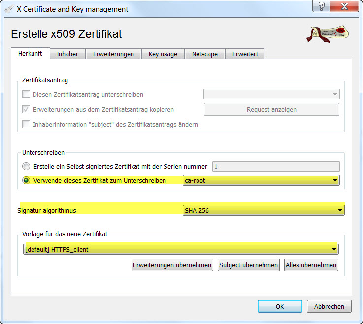 - Zum Unterschreiben das zuvor erstellte CA-Root Zertifikat auswählen und den Signatur Algorithmus SHA 256 wählen. Dann noch Vorlage HTTPS_client aus der Drop-Down Liste wählen.