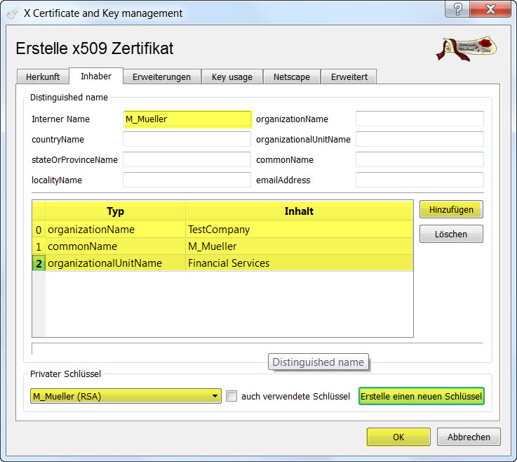 - Zunächst wieder einen neuen privaten Schlüssel erzeugen. Dann einen beliebigen Namen für das Client-Zertifikat eingeben, hier beispielsweise M_Mueller. Anschließend die Eingaben für den ASN.1 Namen des Client_Zertifikats wie gewünscht eingeben. Der Name muss später als entfernte Identität auf dem Lancom Router konfiguriert werden.