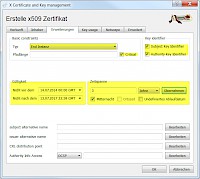 - Unter dem Reiter <Erweiterungen> den Typ <End Instanz> auswählen und die Checkboxen <Critical>, <Subject Key Identifier> und <Authority Key Identifier> klicken. Dann wieder die gewünschte Gültigkeit für das Client-Zertifikat einstellen