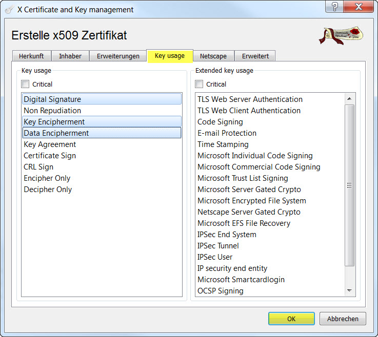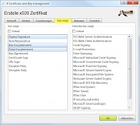- Im Reiter <Key Usage> nun für die Verwendung des Schlüssels die Einträge <Digital Signature>, <Key Encipherment> und <Data Encipherment > auswählen. Anschließend die gemachten Eingaben mit <OK> bestätigen. Es erscheint eine Bestätigungsmeldung und das erstellte Client-Zertifikat wird in die Zertifikatsliste eingetragen.